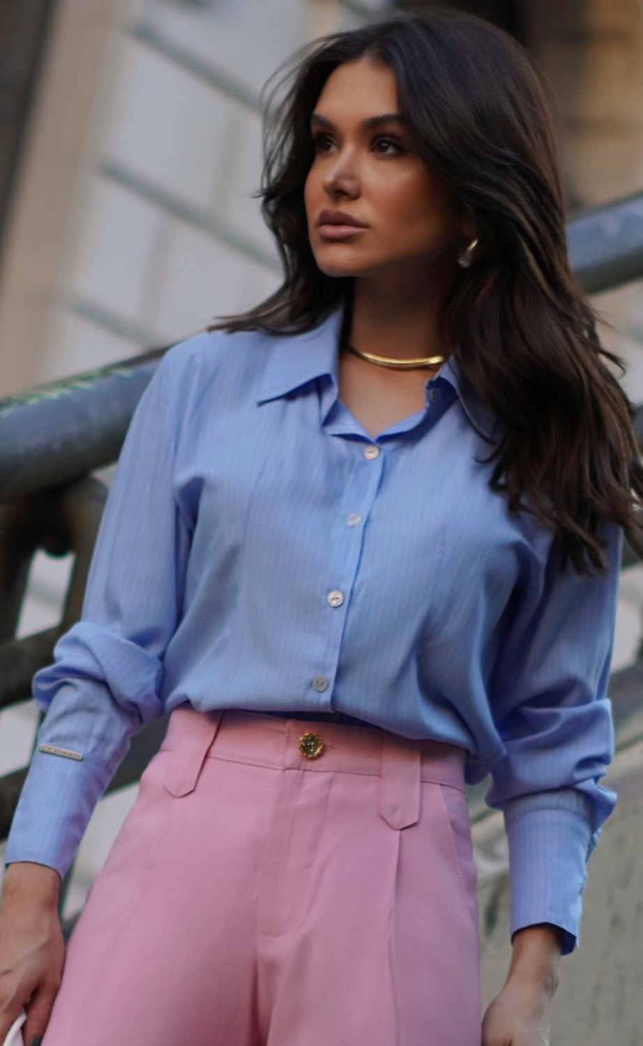 Camisa em viscose com mini listras, camisa confeccionada em viscose leve, com tecnologia que a torna uma peça mais prática e perfeita, não amassa, permanecendo horas impecável. Fechamento com botões